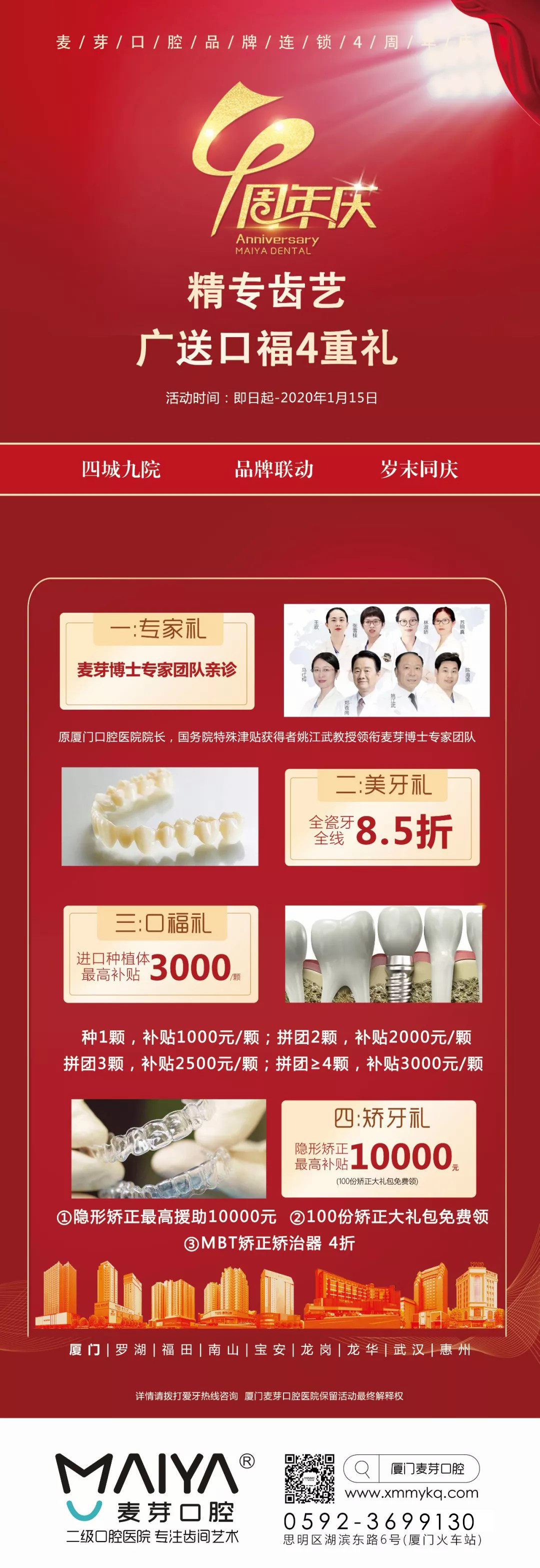 麦芽口腔品牌连锁4周年生日来临之际,四城九院,品牌联动,岁末同庆!即日起至2020年1月15日,厦门麦芽口腔医院广送口福4重礼!