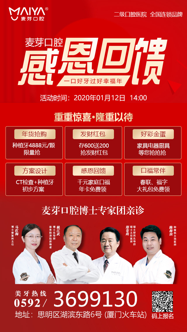 缺牙患者有福啦!2020年01月12日下午14:00,厦门麦芽口腔医院将开展年终感恩回馈活动。