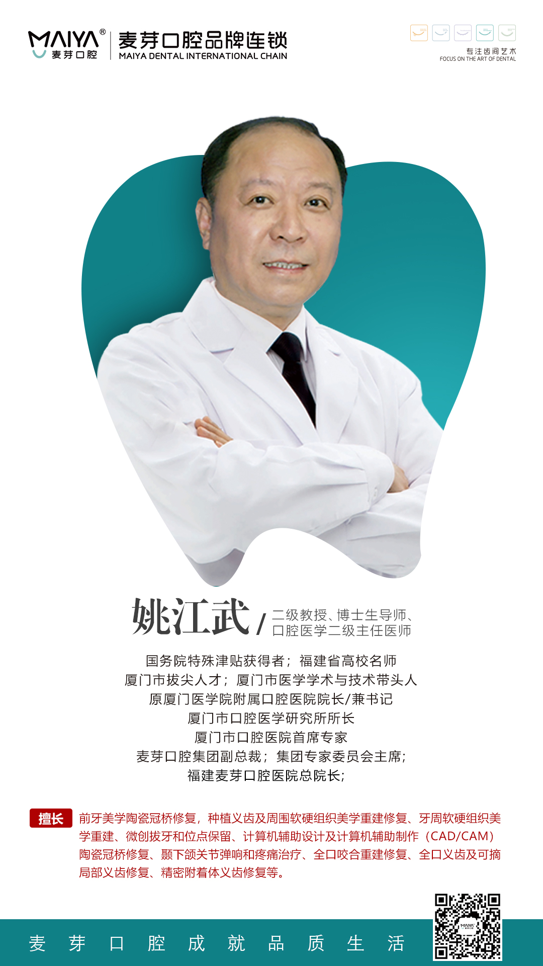2019年7月17日,厦门麦芽口腔医院正式成立,在国务院特殊津贴获得者、原厦门口腔医院院长 姚江武教授 带领下,厦门麦芽口腔医院组建了一支以博硕专家为核心的 博士专家团。