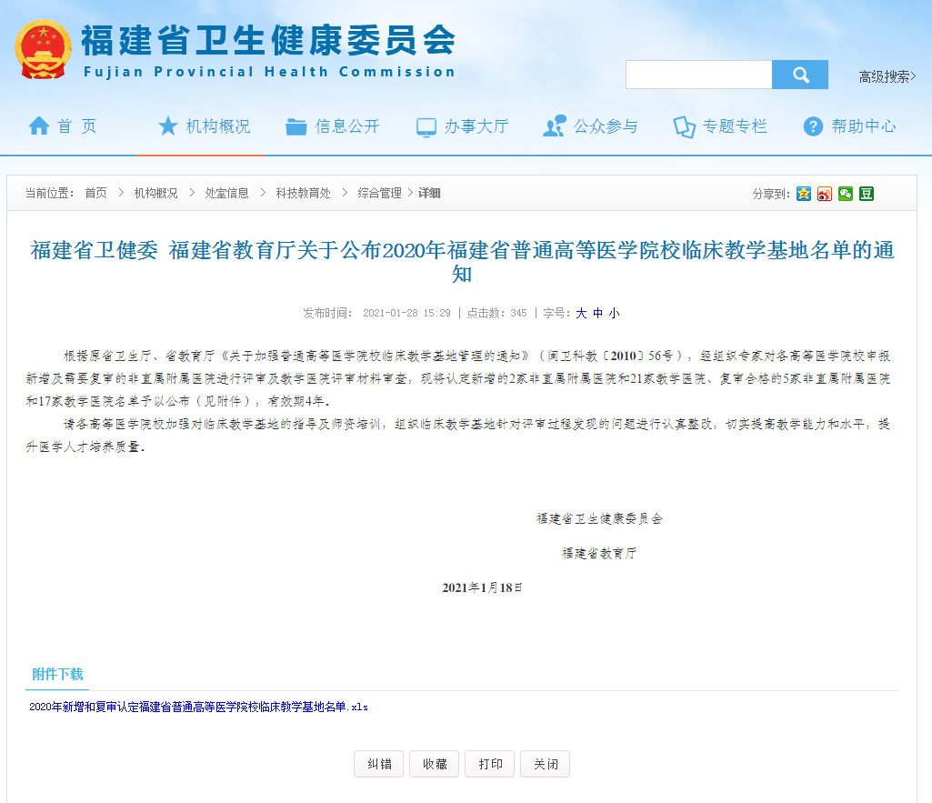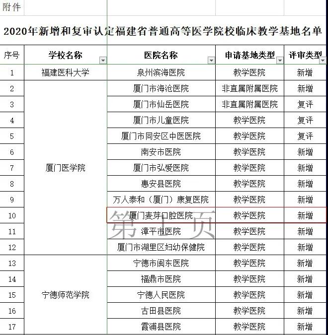 根据原省卫生厅、省教育厅《关于加强普通高等医学院校临床教学基地管理的通知》(闽卫科教〔2010〕56号),经组织专家对各高等医学院校申报新增及需要复审的非直属附属医院进行评审及教学医院评审材料审查,现将认定新增的2家非直属附属医院和21家教学医院、复审合格的5家非直属附属医院和17家教学医院名单予以公布(见附件),有效期4年。