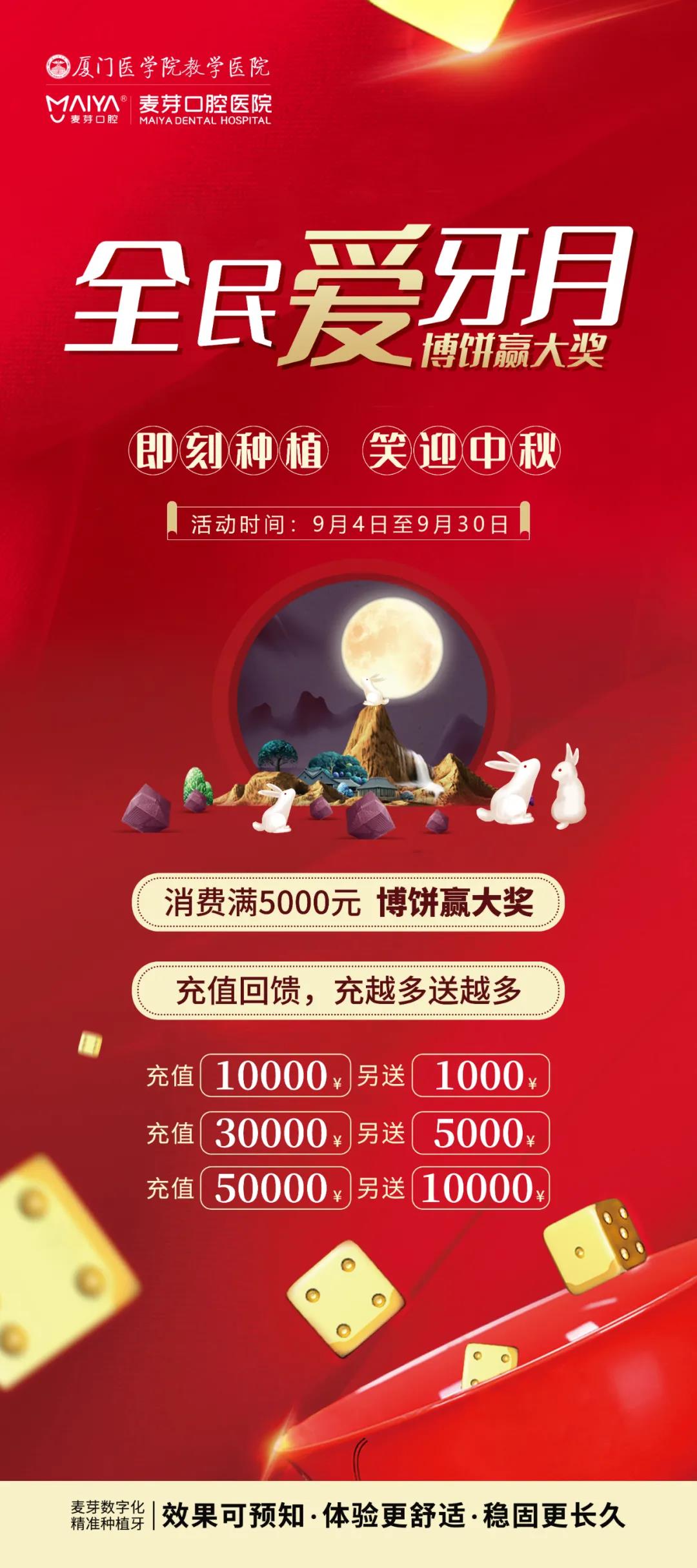 全民爱牙月,9月麦芽邀您来博饼啦!即刻种植 笑迎中秋麦芽口腔消费满5000元,即可博饼赢大奖充值回馈,充越多送越多